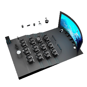 5D影院由三部分組成:立體投影系統;振動座椅和特效設備;計算機控制系統。這三者的協同作用形成一個系統,刺激觀眾的視覺、聽覺、觸覺和感官,再現電影主題所涉及的環境、環境中的各種細節、讓觀眾感受身臨其境的整體效果。